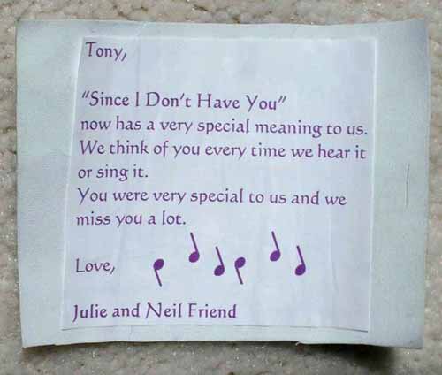 Friends and Family Members, Tony worked as a programmer with my husband Neil and me and for many years while he was going to school. He was delightful and we are very grateful for the time we spent together. There are many stories to tell, but in following the theme of music, I'll relate a musical tale! Neil and I are also singers and musicians. Consequently, we spent lots of time talking about instruments and songs, etc. However, they were working on a particularly large and grueling development project titled SAS. At times it became so overwhelming, they would do anything not to have to code it! They'd turn on the radio, help me fold and stamp newsletters and flyers for my business (in fact it was Tony that introduced us to self adhesive stamps and did they ever save time!) One day however, Neil finally put up signs in each of their offices, "Nothing but SAS!" no talking, no practicing guitars... Focus, focus, focus. However, there wasn't a day that I walked by his office during that time that you couldn't hear the music that flowed from him in the form of humming! To this day, I will never forget that, as we will never forget Tony. I still walk by Neil's office everyday and hear him hum and this brings back fond memories. We wish you all the best, God Bless you. Julie and Neil Friend